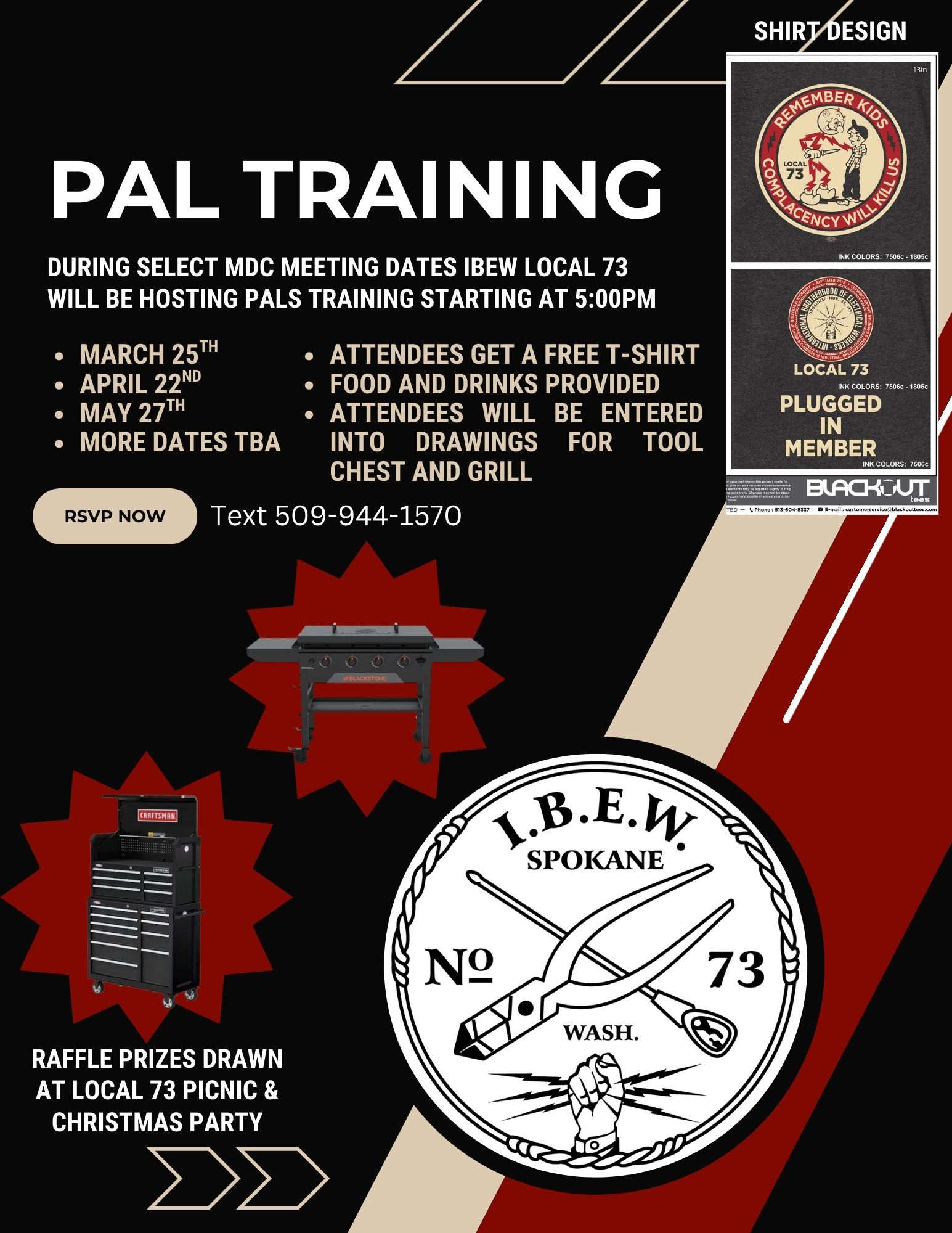 Starting this March, Local 73 will be hosting PAL Training during one of the monthly MDC meetings. The training will start at 5:00PM with food and drinks provided. Each attendee will receive an exclusive "Plugged In Member T-shirt" as well as an entry into a drawing for a flap-top grill and a tool chest. The grill winner will be drawn at the Local 73 Summer Picnic in August, and the tool chest will be drawn at the Christmas Party this December.