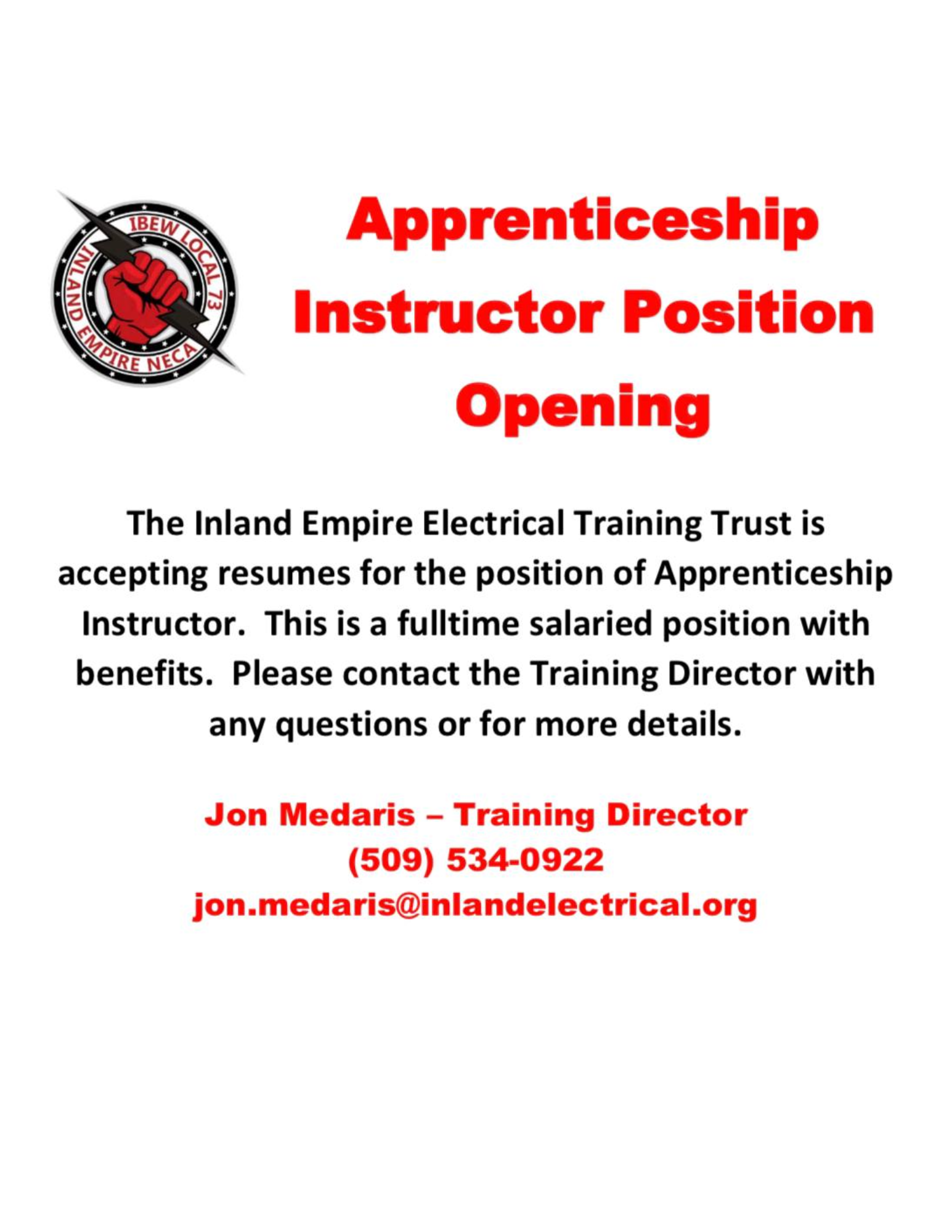The Inland Empire Electrical Training Trust is accepting applications for the position of Apprenticeship Instructor
